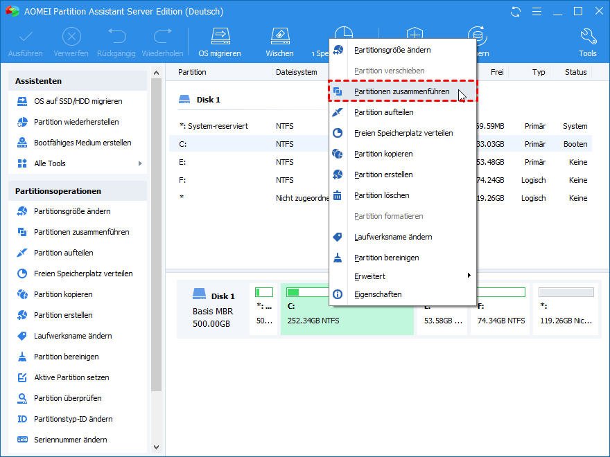 Schritt 1. Installieren Sie AOMEI Partition Assistant Server und führen Sie es aus. Rechtsklicken Sie auf Partition C: in Server 2008 (R2) und wählen Sie Erweitert ⇨ Partitionen zusammenführen.