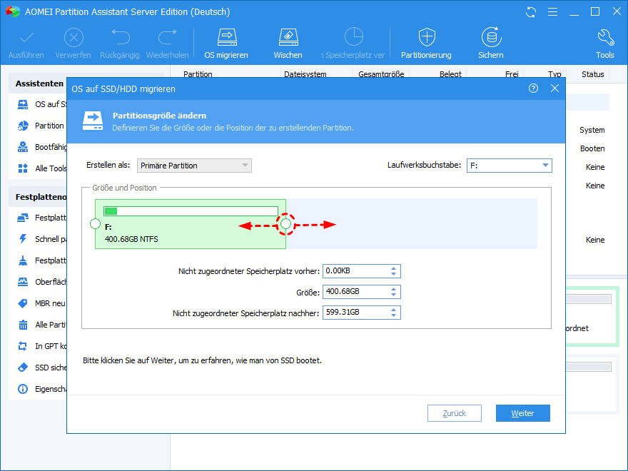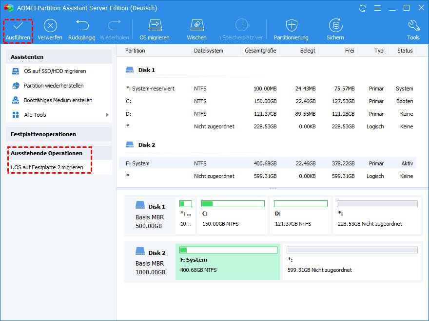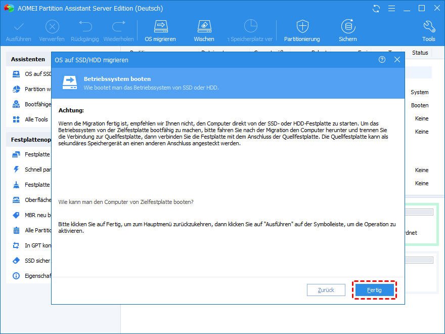 PS: Wenn es keinen nicht zugeordneten Speicherplatz auf der Zielfestplatte gibt, werden alle Partitionen auf der Zielfestplatte gelöscht. Wenn Sie dies nicht möchten, können Sie den AOMEI Partition Assistent Server verwenden, die Größe der Partition ohne Datenverlust auf der Zielfestplatte zu ändern, um nicht zugeordneten Speicherplatz zu erhalten.
