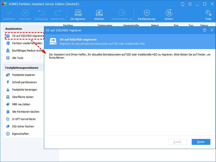 Schritt 1. Installieren Sie den AOMEI Partition Assistant Server und führen Sie es aus. Wählen Sie die Festplatte aus, die das System enthält, und klicken Sie auf Klonen ⇨ OS migrieren. Klicken Sie dann auf Weiter.