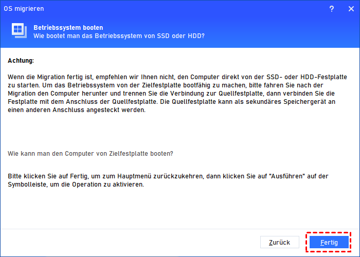 Bitte lesen Sie den Inhalt der Achtung vorsichtig durch und bewahren Sie diesen in Erinnerung. Klicken Sie dann auf Fertig.