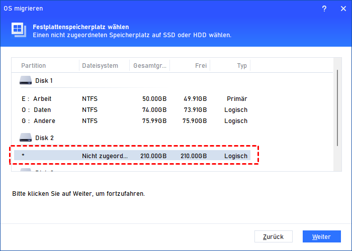 Schritt 2. Wählen Sie einen nicht zugeordneten Speicherplatz auf SSD oder HDD aus. Klicken Sie auf Weiter.