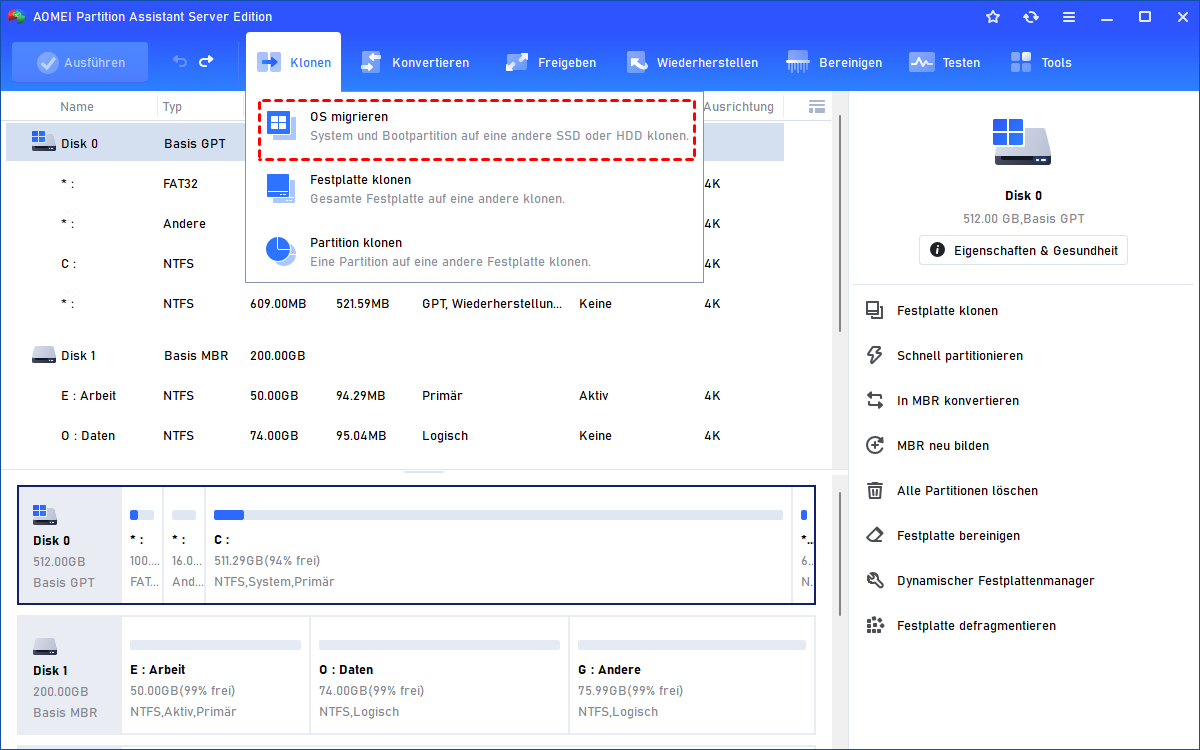 Wenn Sie Server-Systempartitionen und andere Datenpartitionen auf der alten Festplatte migrieren möchten, können Sie die Festplatte klonen vollständig verwenden.