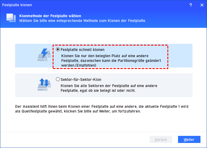 - Festplatte schnell klonen: Auf diese Weise klonen Sie nur den belegten Speicherplatz auf die Zielfestplatte, und nach dem Klonen können Sie die Größe der Partitionen anpassen. Wenn Sie eine HDD auf eine kleinere SSD klonen müssen, können Sie nur den genutzten Speicherplatz klonen.
