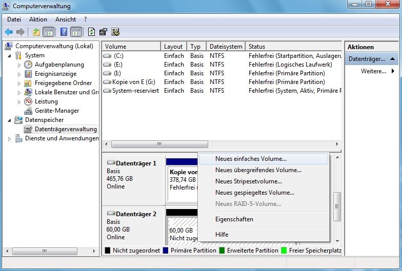 Stellen wir zwei Möglichkeiten her, um eine neue Partition zu erstellen: Windows-Datenträgerverwaltung (üblicher) und AOMEI Partition Assistant. Wenn alle Speicherplätze zugeordnet wurden, wird die Datenträgerverwaltung aber nicht funktionieren.
