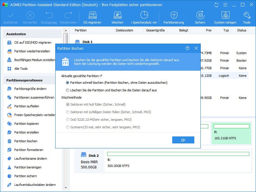 Hinweis: Wenn Sie die Partition und die Daten darauf auslöschen (mit der zweiten Methode), sollten Sie auf AOMEI Partition Assistant Professional upgraden. Und wenn Sie die ganze Festplatte einschließlich der System- und Startpartition löschen möchten, können Sie die Funktion Festplatte bereinigen verwenden.