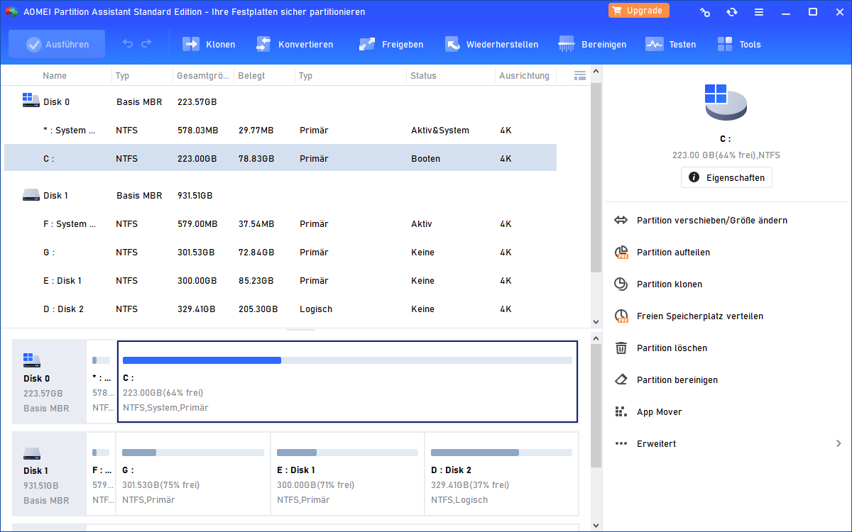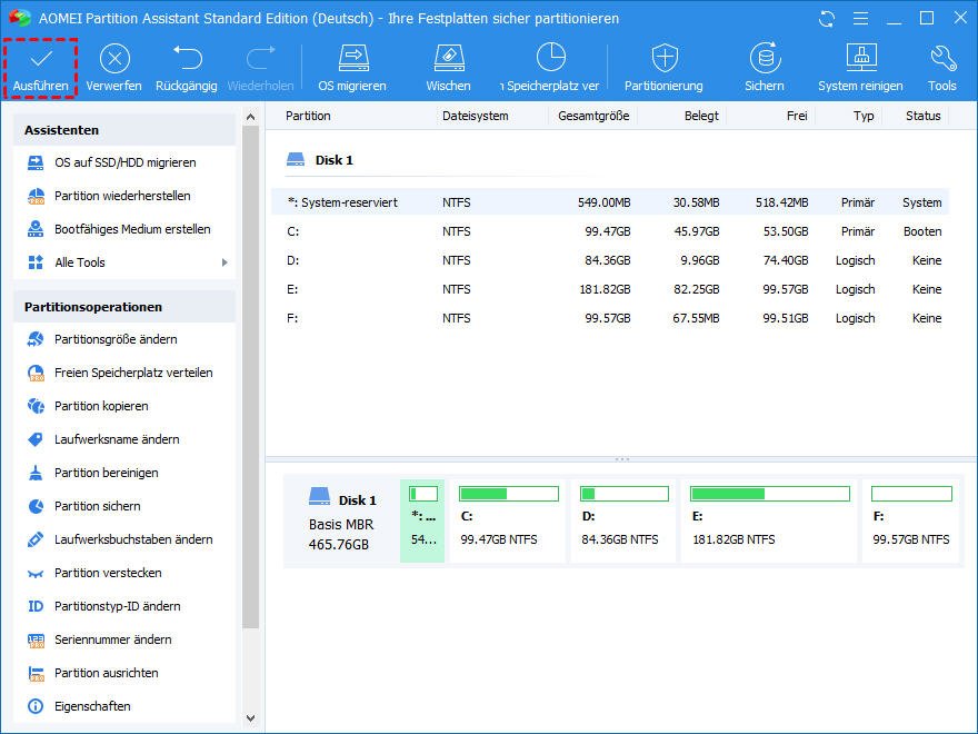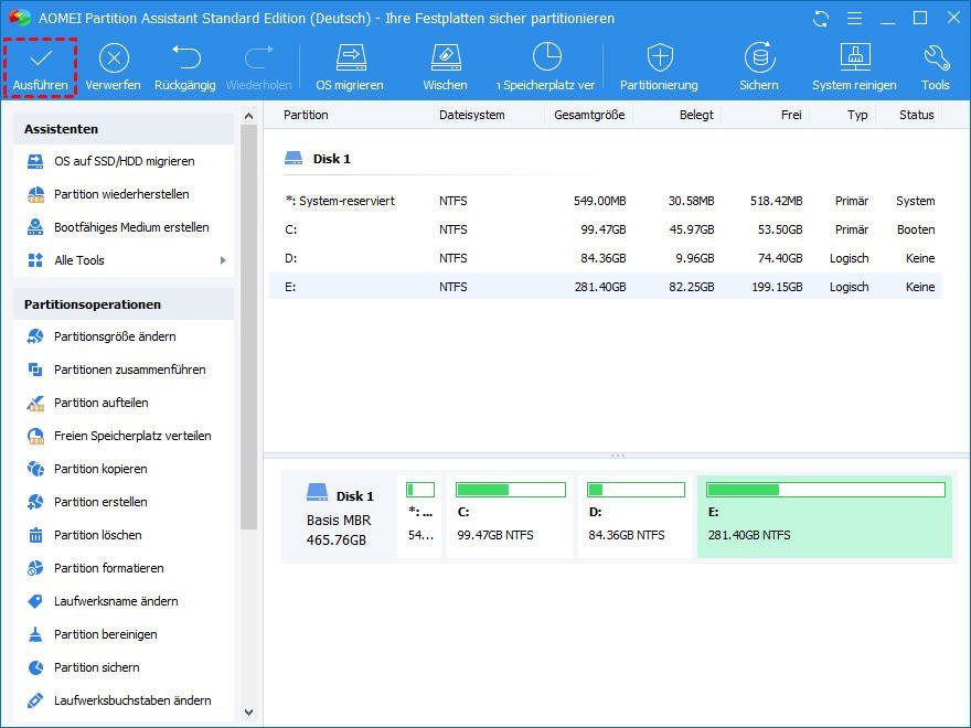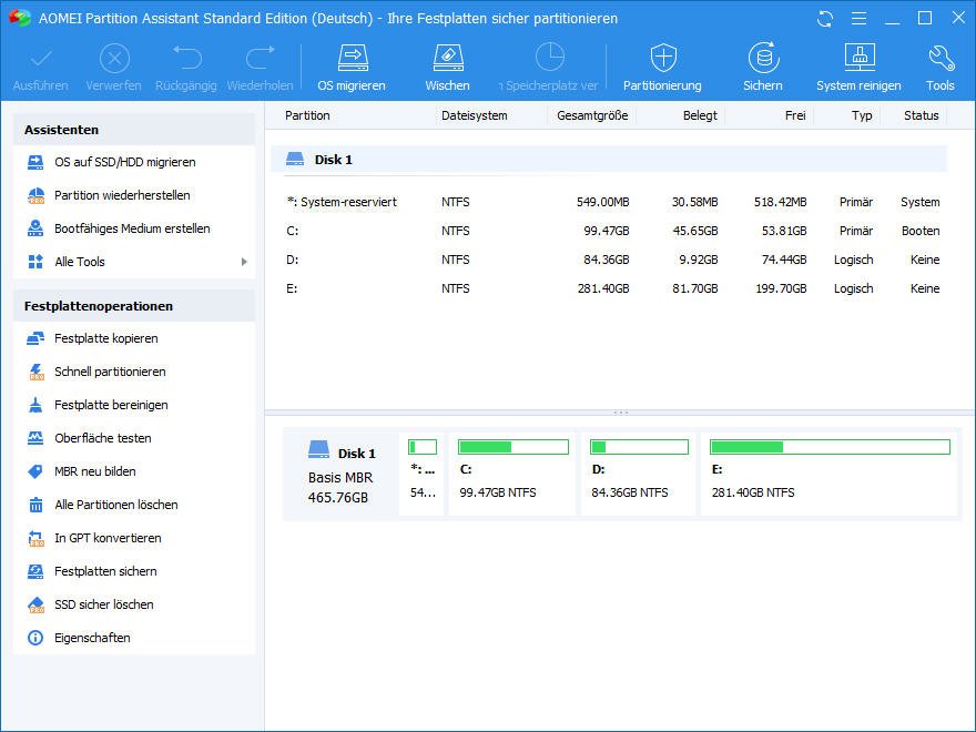 Warum werden wir von diesen einfachen Problemen belästigt? Ich schlage vor, einige verwandte Wörter in Google zu suchen und das Partitionierungsprogramm von Drittanbietern zu finden. Sie können die Sicherheit Ihrer Daten einfach schützen, nachdem Sie entschieden haben, welche Edition von Software zu verwenden, und das Programm vollständig gelernt haben. Hier empfehle ich Ihnen eine professionelle und zuverlässige Software - Partition Assistant. Es ist eine Software für Partitionsverwaltung, mit der Sie ohne Datenverlust Partitionsgröße ändern, Partition erstellen, löschen, Festplatte klonen/kopieren, usw. können.