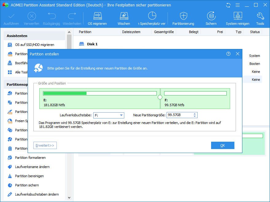 2. Im Popup-Fenster geben Sie für die Erstellung einer neuen Partition die Größe an, und klicken Sie auf OK.