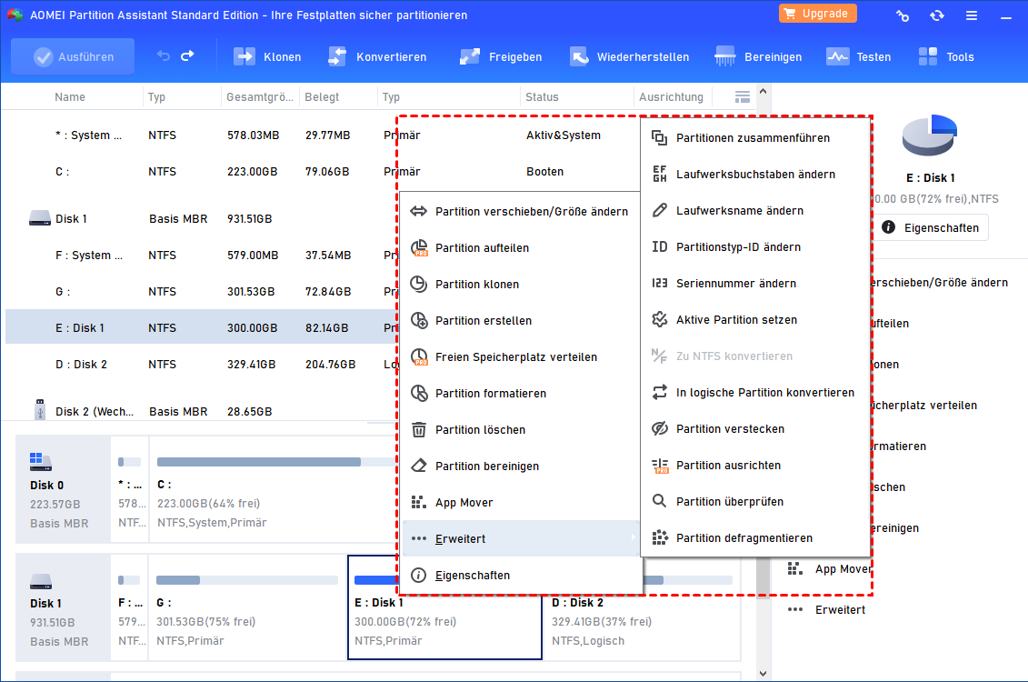 Mit diesem Windows 7-Partitionsmanager können Sie nicht nur die grundlegenden Vorgänge (wie in der Datenträgerverwaltung), sondern auch viele andere erweiterte Vorgänge ausführen (die Datenträgerverwaltung bietet diese nicht). Sie können den Windows 7-Partitionstool kostenlos herunterladen, installieren und auf Ihrem PC starten. Um alle verfügbaren Operationen auf einer Partition zu überprüfen, können Sie mit der rechten Maustaste auf die Zielpartition klicken.