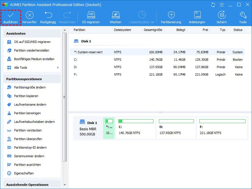 Schritt 3. Führen Sie durch Klick auf „Ausführen“ und „Weiter“ in der Symbolleiste ausstehende Operationen aus.