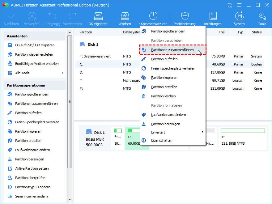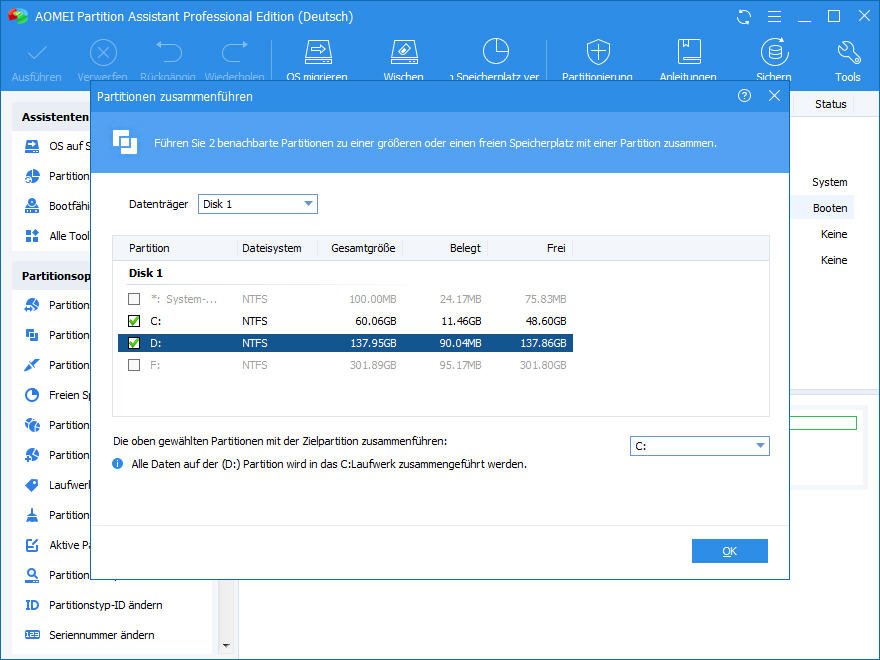 Windows Partitionen zusammenführen mit AOMEI Partition Assistant