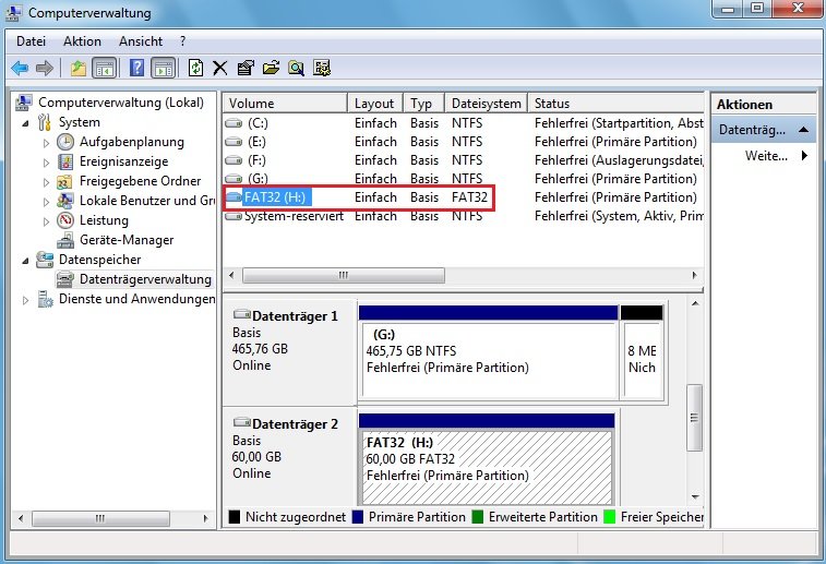 Dann gehen wir zur Datenträgerverwaltung zurück, um das Ergebnis zu überprüfen. Wie gezeigt, haben wir jetzt die Partition von NTFS zu FAT32 erfolgreich konvertiert.