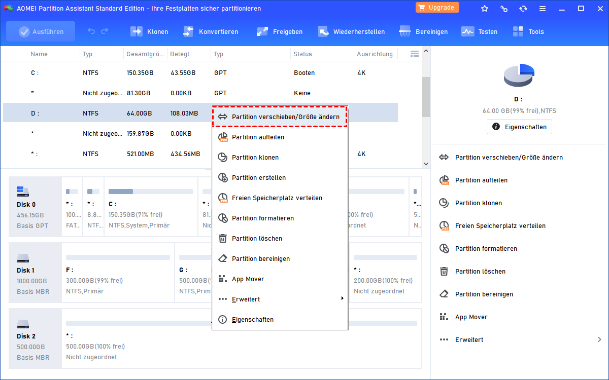 Schritt 2. Rechtsklicken Sie auf die Partition D, wählen Sie Partition verschieben/Größe ändern.