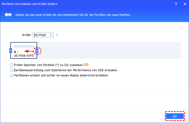 Schritt 3. Im Dialogfeld wird die Partitionsgröße grafisch angezeigt. Wenn der Mauszeiger sich in einen Doppelpfeil verwandelt, ziehen Sie den Griff in die Partitionsgröße, die Sie wollen. Sie können auch eine richtige Größe direkt eingegeben, und klicken Sie auf OK. Danach werden Sie sehen, dass neben dem Laufwerk C nicht zugeordneter Speicherplatz vorhanden ist.