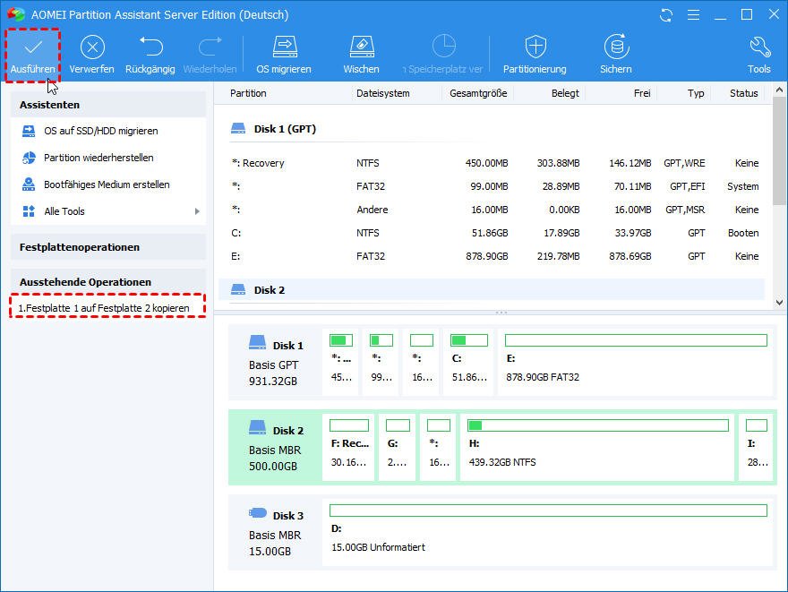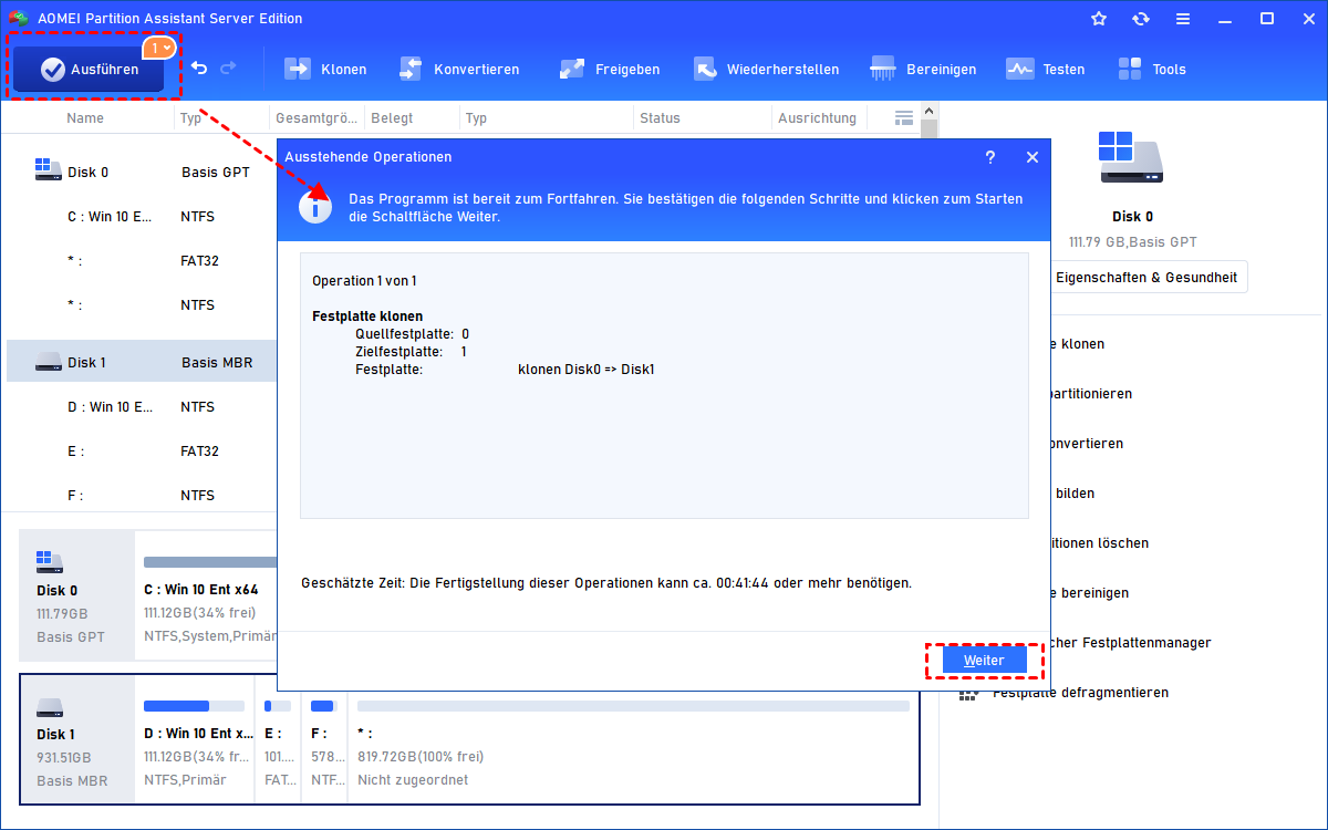 Schritt 6. Kehren Sie zum Hauptmenü zurück. Bitte überprüfen Sie die ausstehenden Operationen und klicken Sie auf „Ausführen“ > „Weiter“, um diesen Vorgang auszuführen.