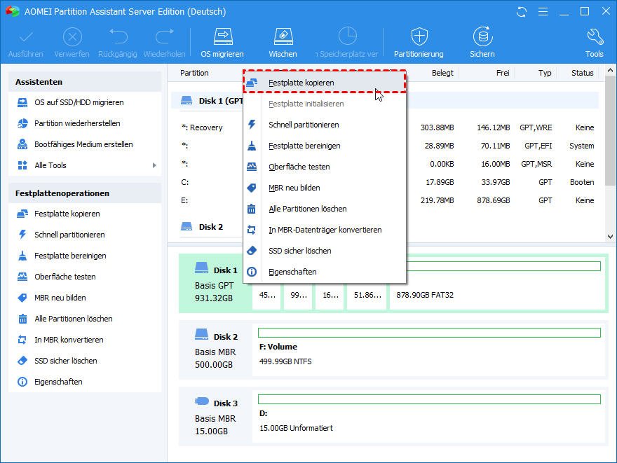 Unter solchen Umständen ist die Frage, wie man in Windows Server 2012 die Festplatte auf SSD klonen kann. Es ist erforderlich, zuverlässige und sichere Software zu verwenden, um diesen Vorgang abzuschließen. Hier wird dringend empfohlen, AOMEI Partition Assistant Server auszuprobieren.