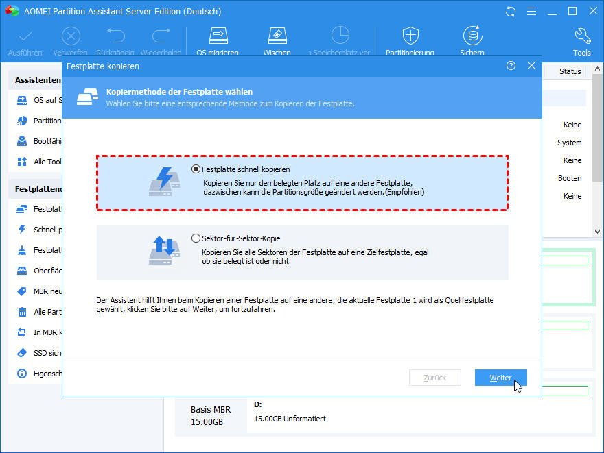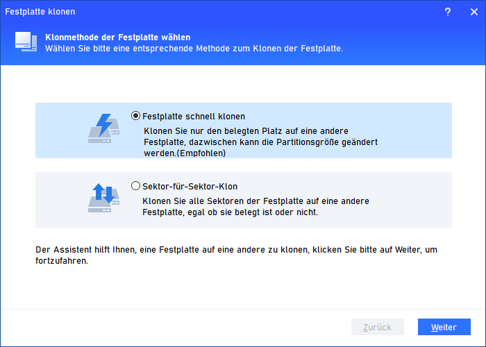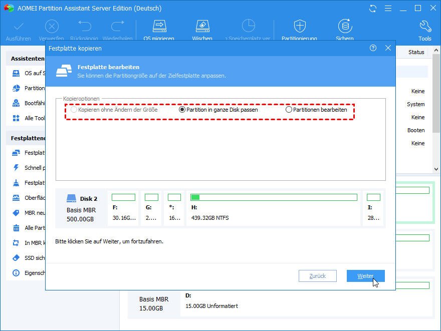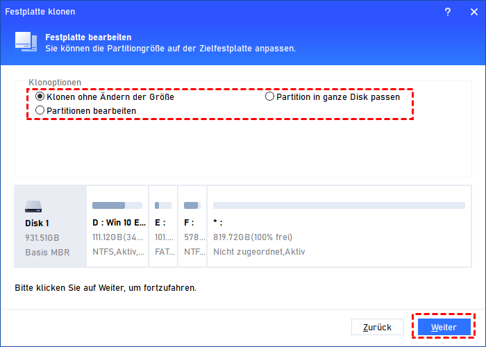 HINWEIS: Es gibt drei Optionen, die Sie wählen können: „Klonen ohne Ändern der Größe“, „Partition in ganze Disk passen“ und „Partitionen bearbeiten“.