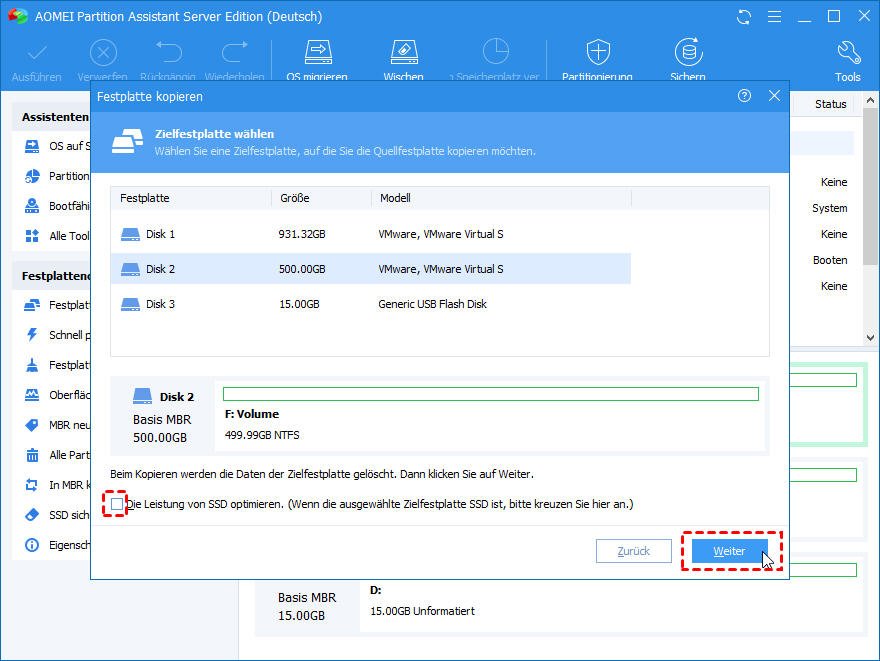 Schritt 3. Wählen Sie eine Zielfestplatte aus, auf die die Quellfestplatte kopiert werden soll. Klicken Sie dann auf „Weiter“.