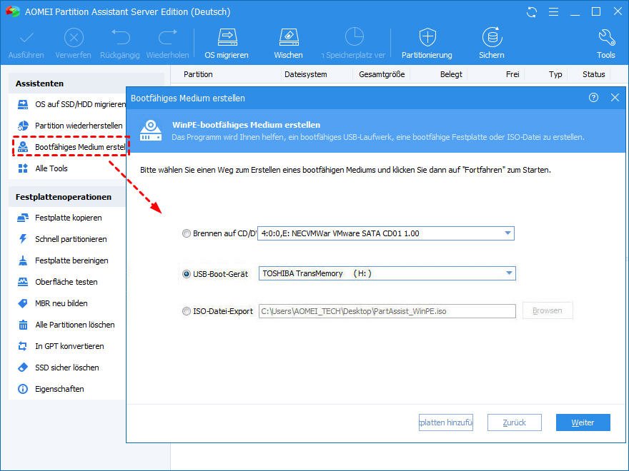 Mit der neuen Funktion Tragbare Version erstellen können Sie AOMEI Partition Assistant auf einem Wechseldatenträger erstellen, z.B. einem USB-Stick, sodass Sie den Wechseldatenträger an andere Computer anschließen und AOMEI Partition Assistant ohne Installation von dem Wechseldatenträger ausführen können.