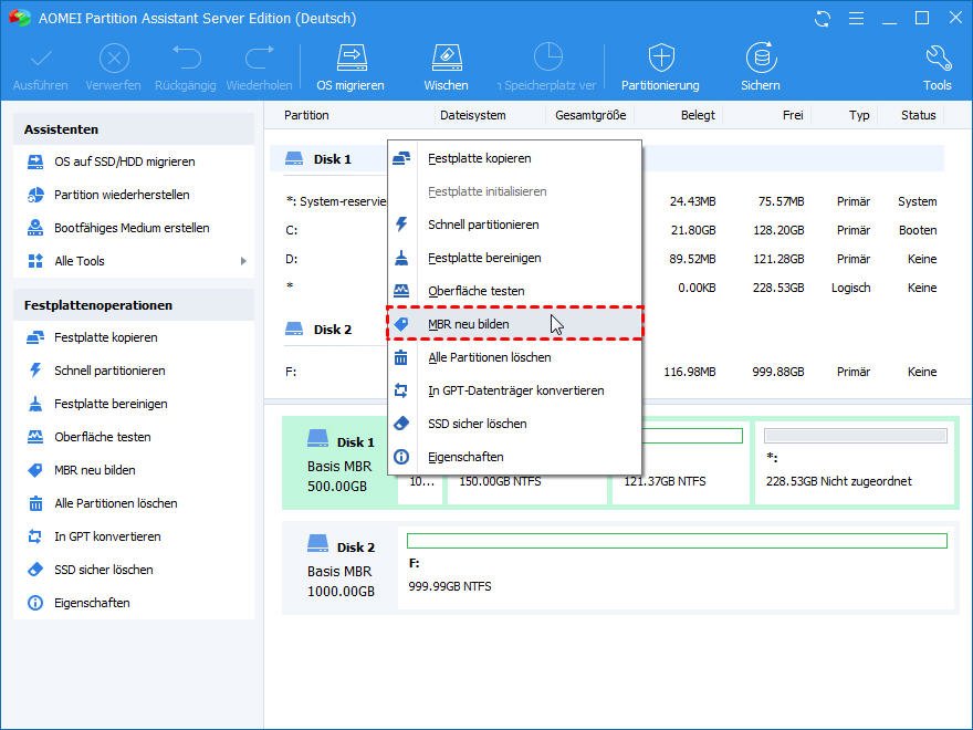 3. Nach der Anmeldung wird AOMEI Partition Assistant Server automatisch gestartet. Finden Sie den Datenträger, der den beschädigten MBR hat, klicken Sie mit der rechten Maustaste darauf und wählen Sie MBR neu bilden.
