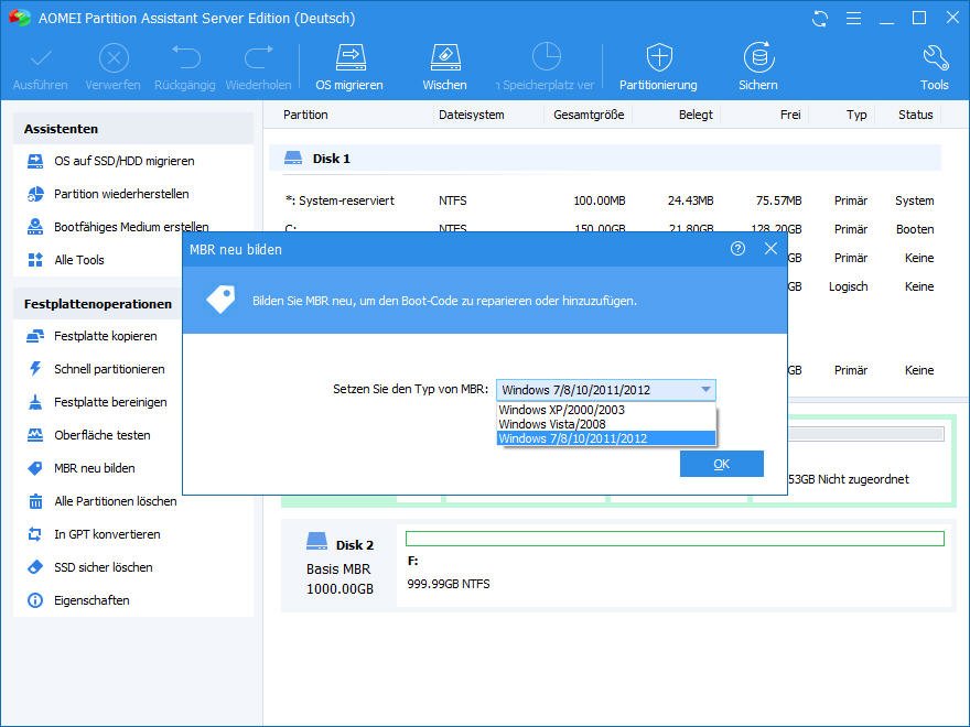 4. Wählen Sie im Pop-up-Fenster den richtigen Typ von MBR für Server 2012. In diesem Fall wählen Sie die Option Windows 7/8/10/11/2011/2012.
