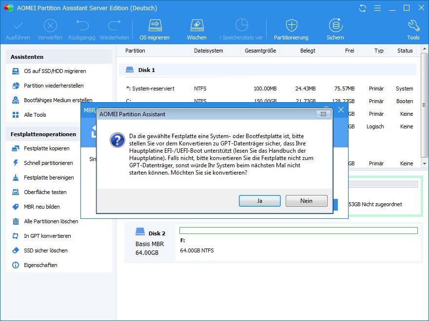 Damit können Sie innerhalb weniger Klicks die Systemfestplatte von MBR in GPT konvertieren, ohne Daten zu verlieren. Und auch können Sie mit dieser Software Nicht-Systemfestplatten in GPT konvertieren, ohne Partitionen löschen zu müssen.