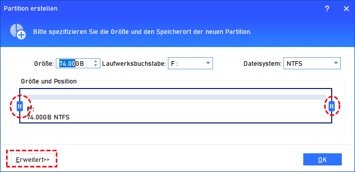 Schritt 2. In dem sich öffnenden Fenster können Sie die Details der neuen Partition angeben, einschließlich der Partitionsgröße (hier sollten Sie die Standardgröße – den gesamten nicht zugewiesenen Speicherplatz wählen), des Laufwerksbuchstabens, des Dateisystems, der Partitionsbezeichnung und so weiter.