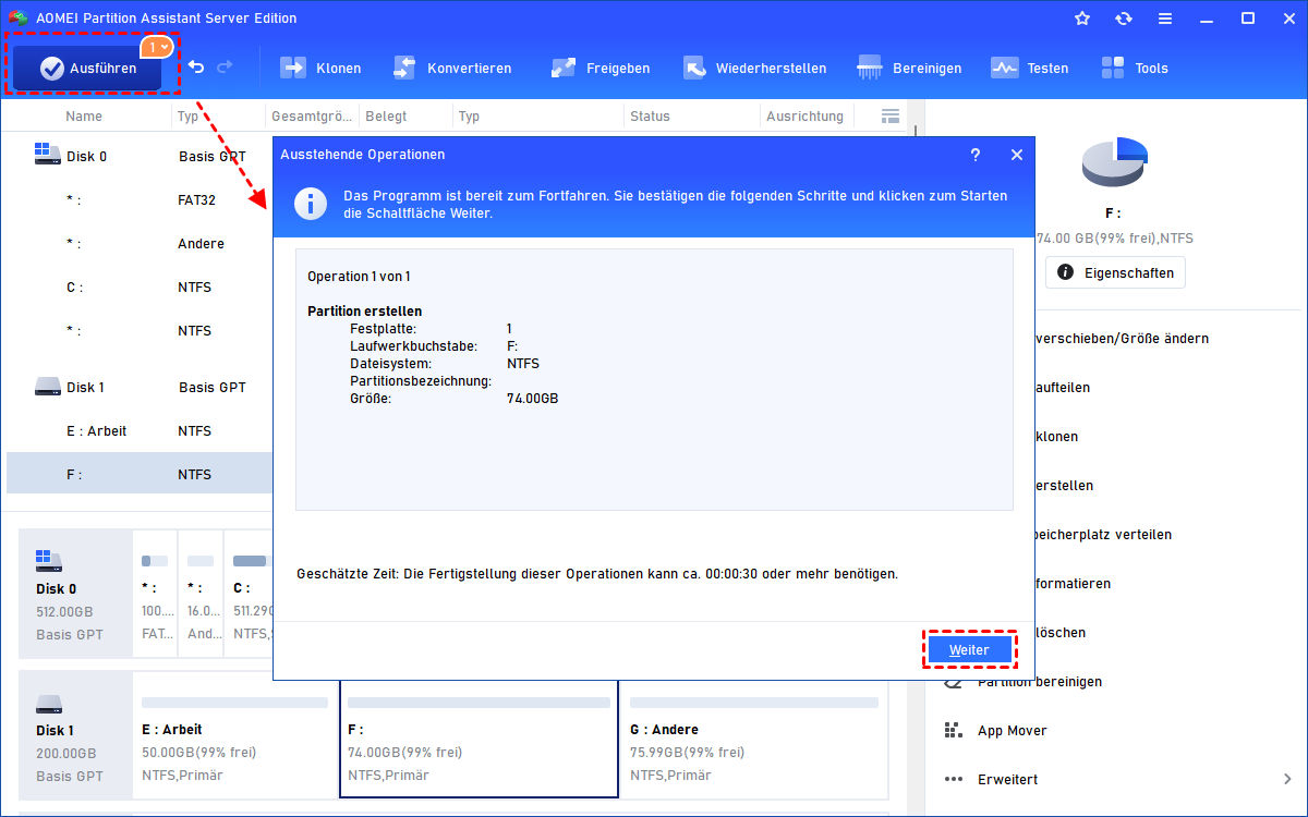 Schritt 3. Klicken Sie auf OK, um eine Vorschau der neuen Partition, die Sie erhalten werden, zu sehen. Wenn Sie damit zufrieden sind, klicken Sie einfach auf Ausführen, um den Vorgang zu starten. Wenn der Vorgang abgeschlossen ist, schließen Sie ihn.