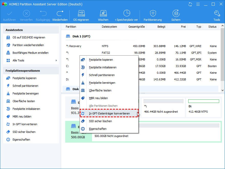 Konvertieren auf MBR/GPT Disk ohne Datenverlust.