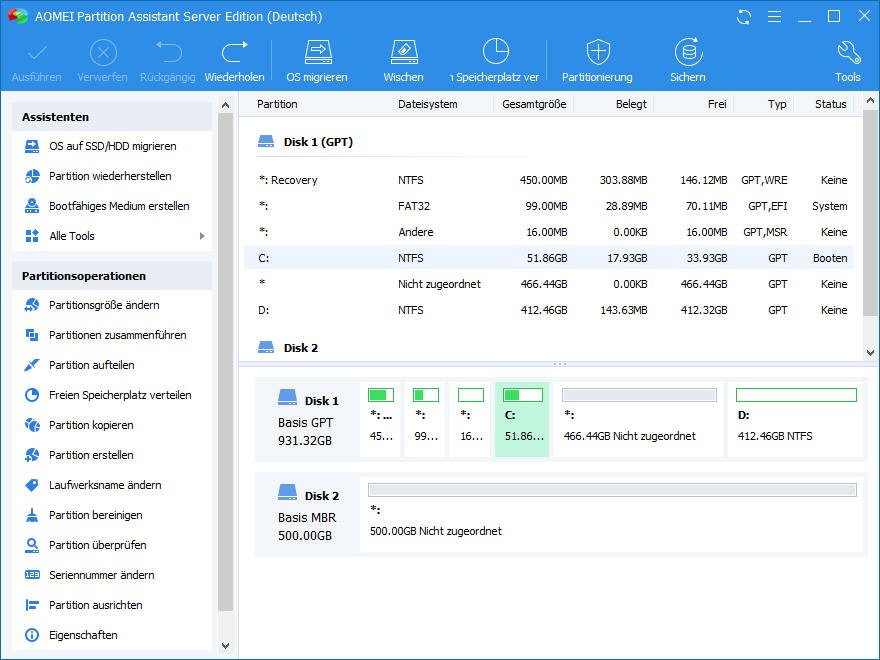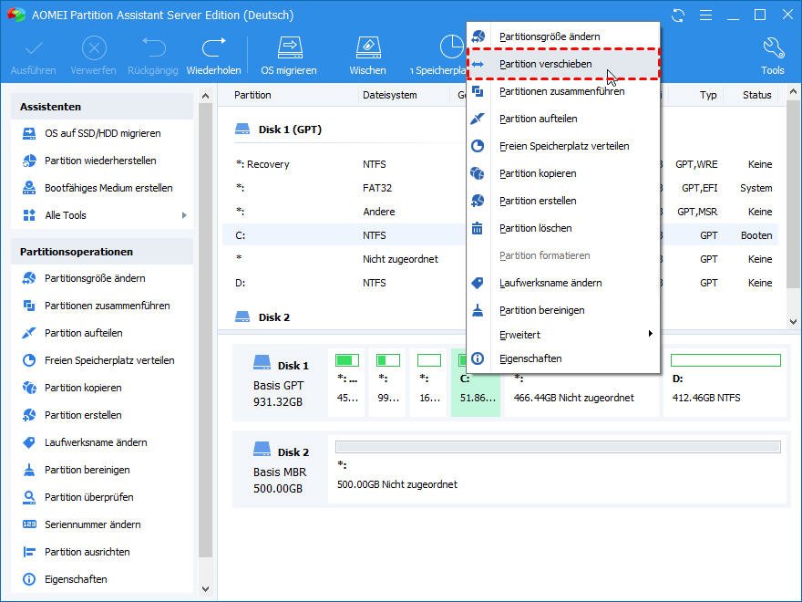 Als eine gute Software für Partitionsverwaltung bietet AOMEI Partition Assistant eine sehr intuitive Hauptschnittstelle, daher können Sie die Software problemlos benutzen. Durch einen Klick auf eine Festplatte oder Partition werden alle verfügbaren Optionen in der Symbolleiste dargestellt. Sie können auch mit der rechten Mäuse auf die Partition oder Festplatte klicken, um die verfügbaren Optionen zu sehen.