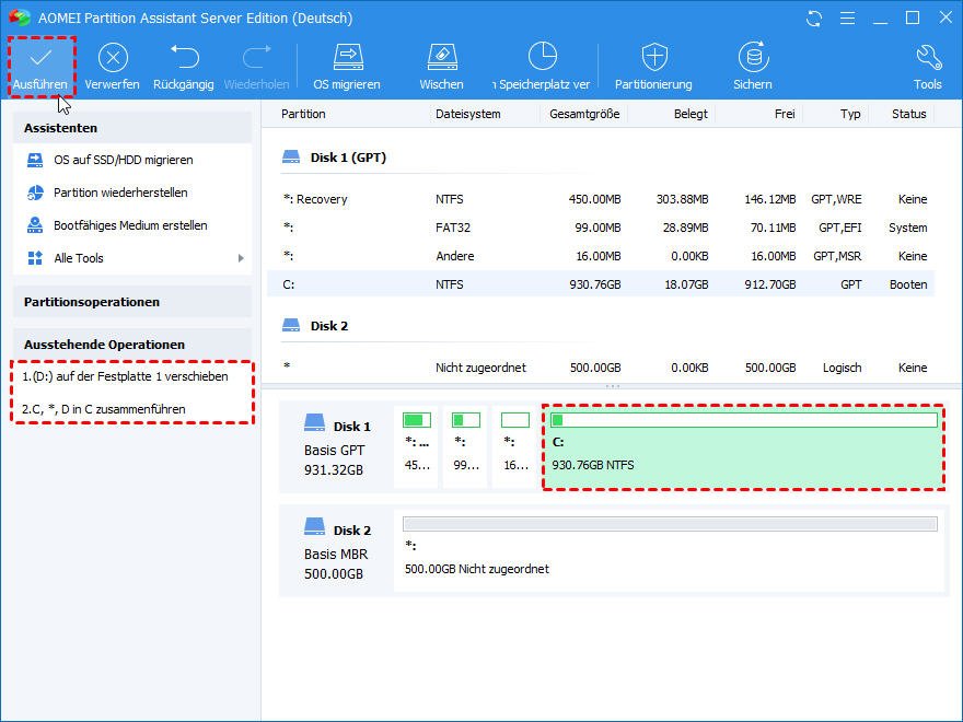 Daraufhin, Suche nach einem Verfahren zur flexiblen Zusammenführung der Partitionen und zum Halten der Datensicherung mit sicherer Weise ist wichtiger. Die Software von Drittanbietern AOMEI Partition Assistant Server könnte hilfreich sein.