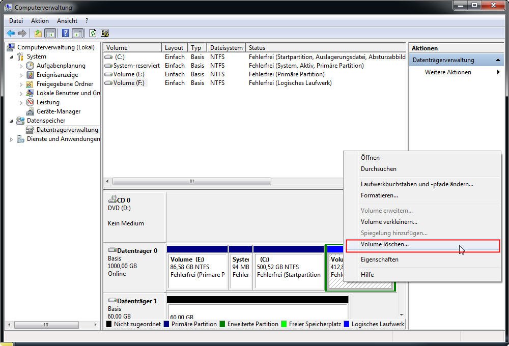 Zum Beispiel, wenn Sie Laufwerk C: und Laufwerk D: zusammenführen möchten, müssen Sie Laufwerk D: erst löschen, wie das folgende Bild zeigt: