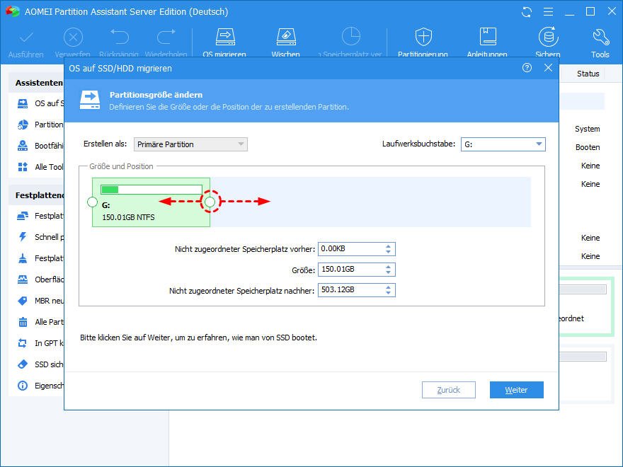 Schritt 3. Hier können Sie die Systempartition auf der SSD anpassen. Klicken Sie dann auf Weiter.