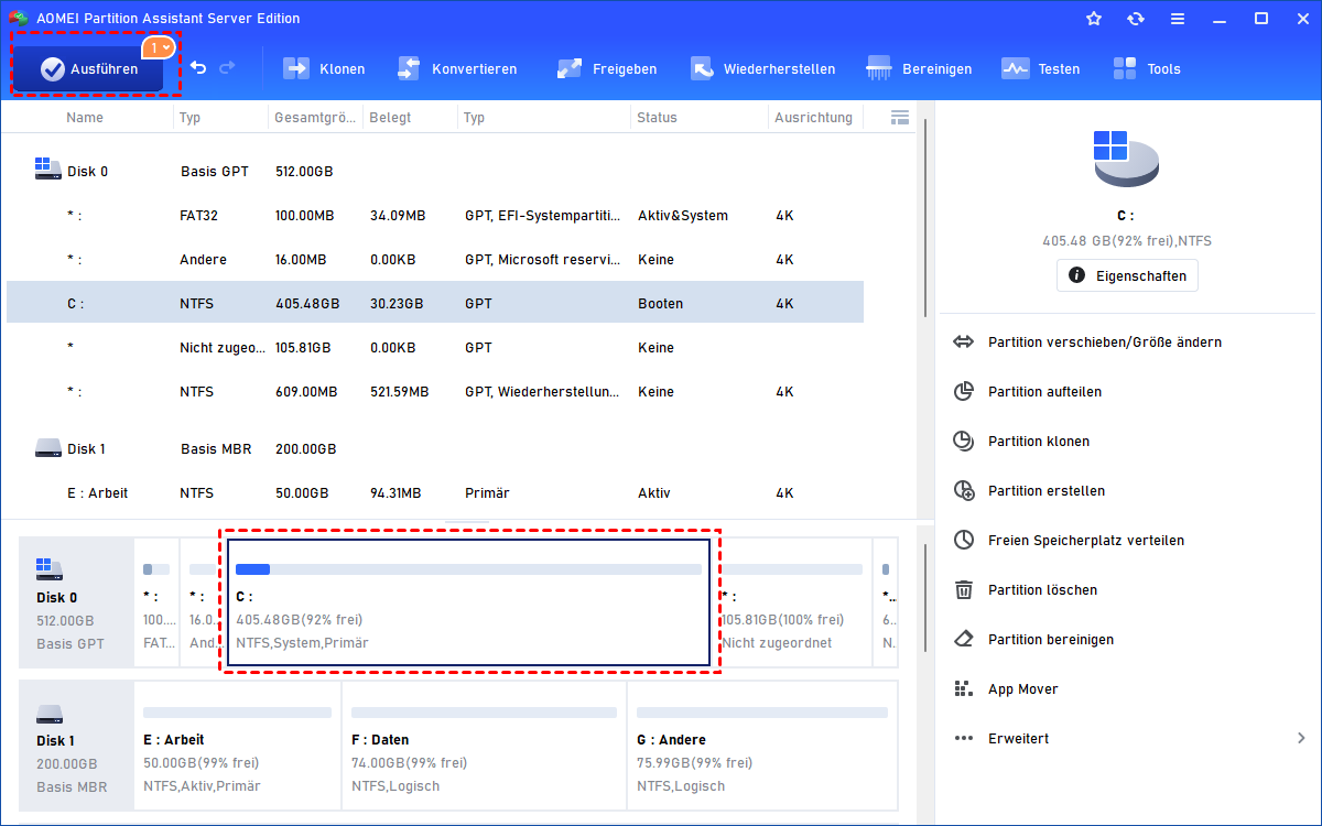 Wenn Sie denken, dass die Datenträgerverwaltung in Windows Server 2016 nicht genug für Sie ist, oder Sie brauchen noch weitere erweiterte Funktuinen benötigen, können Sie AOMEI Partition Assistant Server ausprobieren. Wenn Sie diese Software auf mehreren PCs und Server installieren müssen, können Sie je nach Bedarf die AOMEI Partition Assistant Technician oder Unlimited Edition in Betracht ziehen. Die Technician und Unlimited Edition verfügen über eine hilfreiche Funktion, Tragbare Version erstellen, mit der Sie AOMEI Partition Assistant auf einem Wechseldatenträger erstellen können.