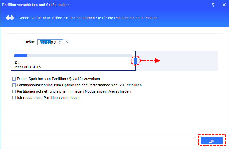 5. Im Popup-Fenster, ziehen Sie den Regler, um zu entscheiden, wie weit Sie die Partition erweitern möchten.