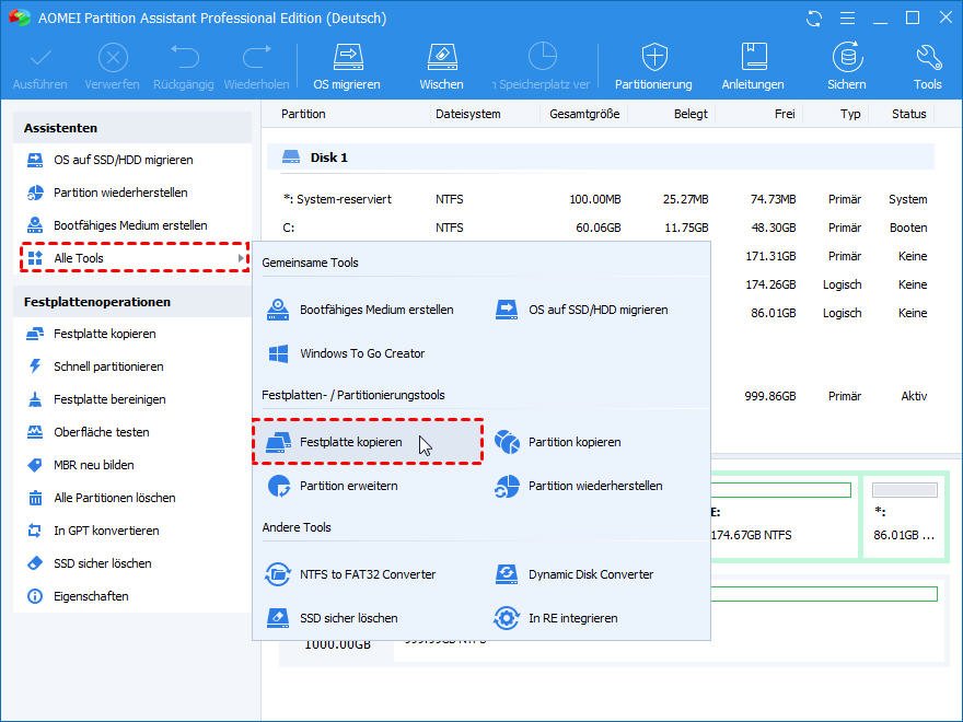 Einige Benutzer versuchten, ihr zweites Speicherlaufwerk durch Samsung Magician mit Samsung SSD 850 EVO zu ersetzen, diese Software kann jedoch 850 EVO SSD nicht erkennen. Unter diesen Umständen können Sie eine andere Festplattenklon-Software versuchen. AOMEI Partition Assistant Professional, als einer der besten Partition Manager, könnte eine hervorragende Aufgabe machen.