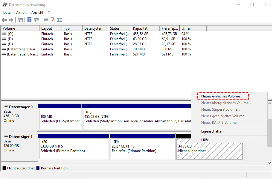 Wenn Sie die Samsung SSD immer noch nicht von der Liste finden können. Verbinden Sie die SSD mit einem anderen Computer. Wechseln Sie zur Windows-Datenträgerverwaltung. Rechtsklicken Sie auf die SSD und wählen Sie „Neues einfaches Volume“, um eine neue Partition zu erstellen. Dann machen Sie die Installation erneut, und Sie werden feststellen, dass es sich genau dort befindet, wenn Sie zu dem Laufwerk kommen, auf dem Sie Windows installieren möchten.
