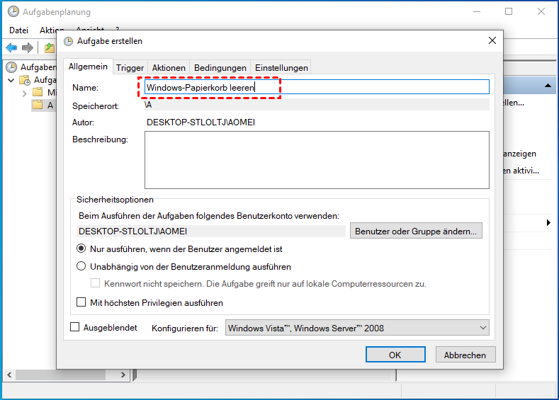 Schritt 4. Geben Sie einen Namen für die Aufgabe ein, z. B. Windows-Papierkorb leeren.