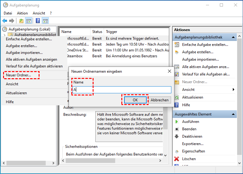 Schritt 2. Klicken Sie mit der rechten Maustaste auf Aufgabenplanungsbibliothek und wählen Sie Neuer Ordner. Benennen Sie den Ordner (stellen Sie sicher, dass er von den Systemaufgaben getrennt ist.) und klicken auf OK.