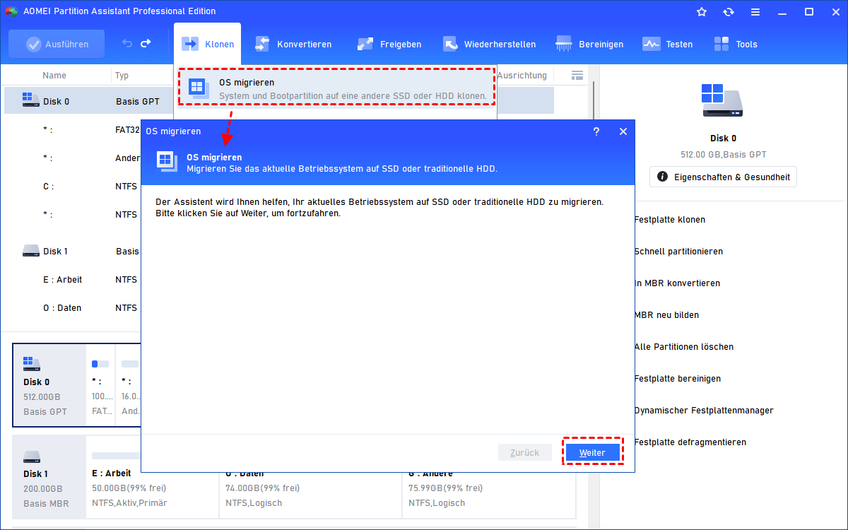 Aber wie geht das? Hier empfehle ich den besten Partition-Manager AOMEI Partition Assistant Professional, um Windows 7, 8, 10, 11 mit nur wenigen Klicks von Ihrer aktuellen HDD auf die neue SSD zu migrieren. Wenn Sie alle Daten von einer Festplatte auf eine andere verschieben möchten, können Sie außerdem die Funktion „Festplatte klonen“ verwenden.
