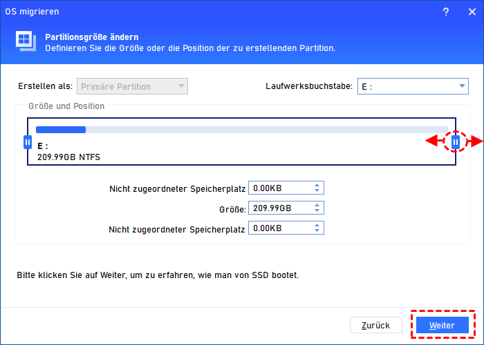 Schritt 3. Hier können Sie die Partitionsgröße auf der SSD anpassen. Klicken Sie anschließend auf Weiter, um fortzufahren.