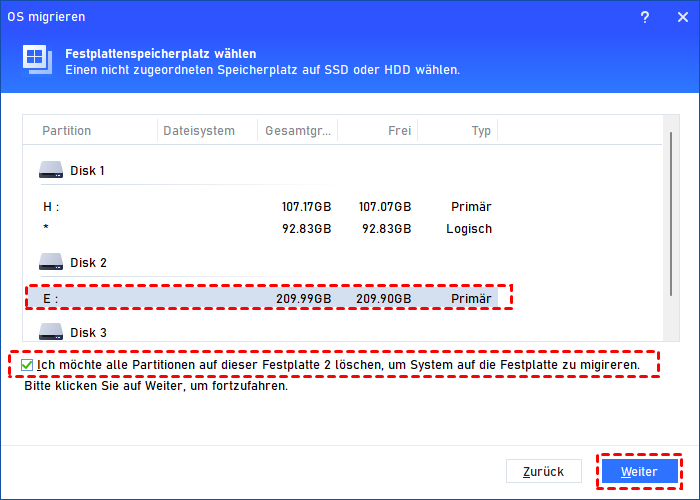 Schritt 2. Wählen Sie einen nicht zugeordneten Speicherplatz auf der neuen SSD aus. Wenn kein nicht zugeordneter Speicherplatz vorhanden ist, aktivieren Sie die Option „Ich möchte alle Partitionen auf dieser Festplatte löschen, um System auf die Festplatte zu migrieren“. Klicken Sie dann auf Weiter.