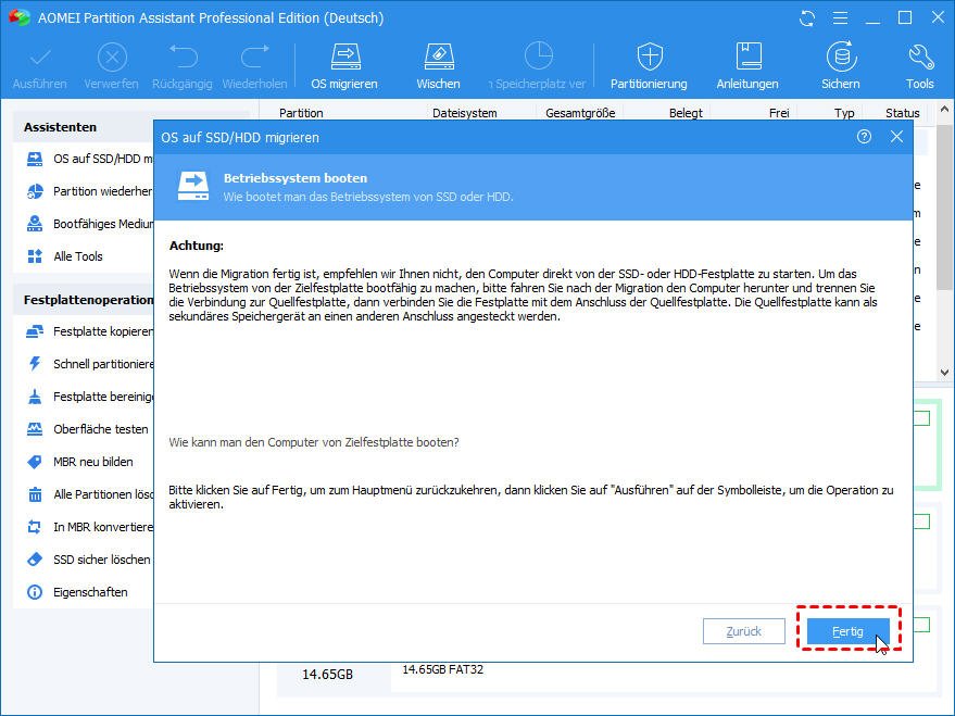 Schritt 4. Nachdem Sie die Notiz von Betriebssystem booten gelesen haben, klicken Sie auf Fertig, dann werden Sie auf die Hauptschnittstelle zurückgeben.