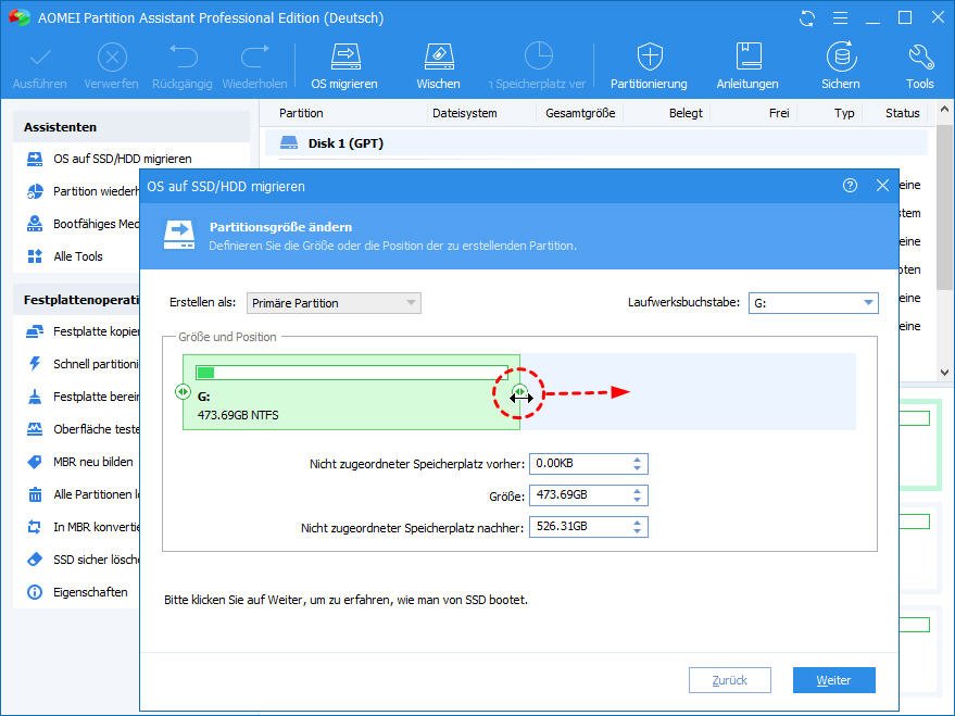 Schritt 3. In diesem Fenster können Sie den Schieberegler nach links ziehen, um eine Größe für die neue Partition auf SSD zu wählen, und dann klicken Sie auf Weiter.