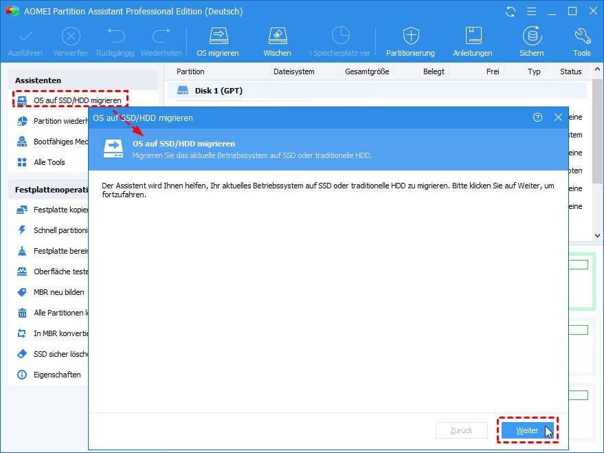Schritt 1. Downloaden, installieren und führen Sie diese Software aus. Klicken Sie auf Klonen ⇨ OS migrieren auf der oberen Seite. Und dann klicken Sie im Pop-Fenster auf Weiter.