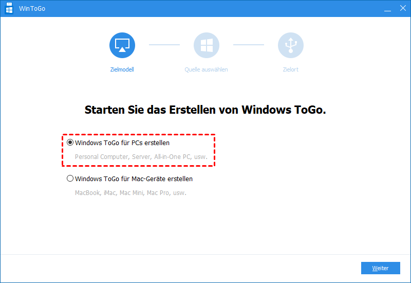 Schritt 2. Im Popup-Fenster gibt es zwei Methoden, wählen Sie eine nach Ihrer Situation. Hier wählen wir die erste „Windows ToGo für PCs erstellen“ als Beispiel.