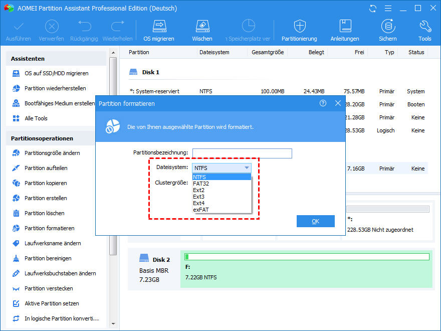 Der Partitionsmanager AOMEI Partition Assistant ist in der Lage, RAW-Laufwerke in NTFS, FAT32 oder exFAT zu formatieren, egal wo sich die Partition befindet. Darüber hinaus überwindet er die inhärenten Grenzen des in Windows integrierten Formatierungswerkzeugs und kann eine 64-GB-SD-Karte in FAT32 formatieren. Werfen wir einen genaueren Blick darauf.