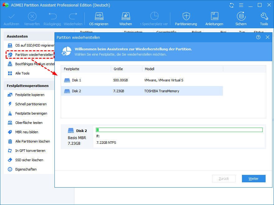 AOMEI Partition Assistant Professional ist ein leistungsstarker Partition-Manager, der gelöschte und formatierte Partitionen wiederherstellen kann, solange keine neuen Daten auf diese Partition geschrieben werden. Es unterstützt Windows 10 (32bit und 64bit), Windows 11. Hier können Sie die Demoversion herunterladen, um den ganzen Vorgang zuerst zu testen.