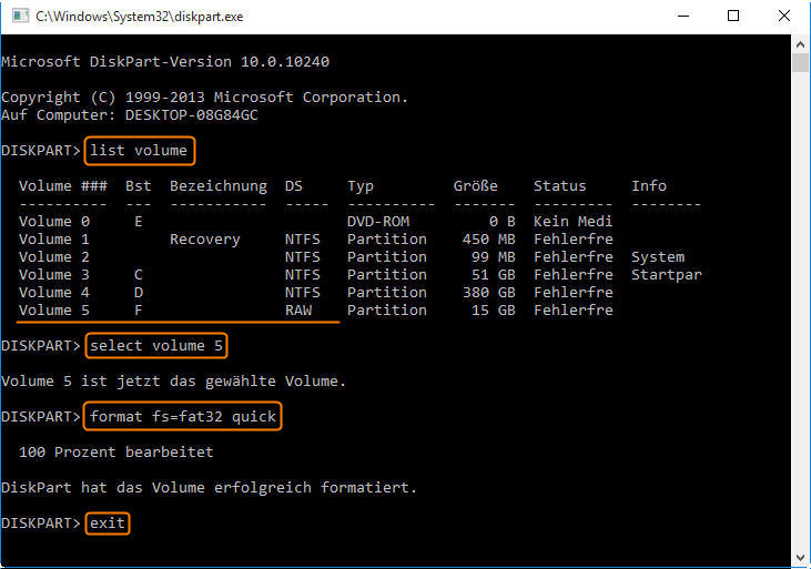 list volume → select volume n (wobei n die Datenträgernummer des RAW-Laufwerks ist) → format fs=fat32 quick (Sie können fat32 durch ntfs oder exfat ersetzen) → exit.