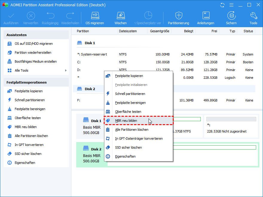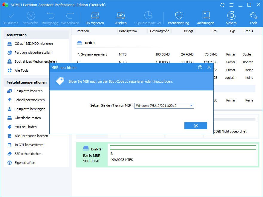 Eine andere effektive Methode besteht darin, den MBR zu reparieren oder neu zu erstellen. Für diesen Vorgang benötigen Sie die Hilfe von Drittanbieter-Software, hier empfehlen wir die Software AOMEI Partition Assistant, die Ihnen helfen kann, dieses Problem effektiv zu lösen.