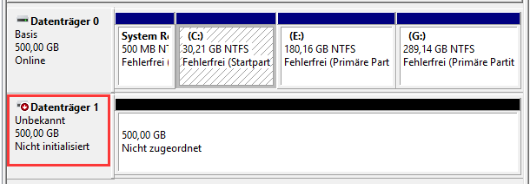 Situation 1: Datenträger unbekannt, nicht initialisiert, ohne Festplattenkapazität
